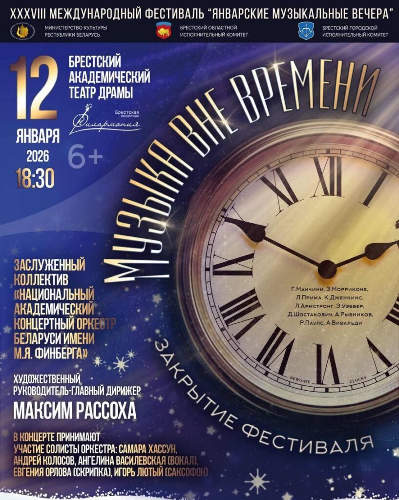 12 января 2026 состоится Торжественное закрытие XXXVIII Международного фестиваля «Январские музыкальные вечера» на сцене Брестского академического театра драмы в 18:30. Заслуженный коллектив Республики Беларусь «Национальный академический концертный оркестр Беларуси имени М.Я.Финберга», художественный руководитель-главный дирижер Максим РАССОХА, представит концертную программу «МУЗЫКА ВНЕ ВРЕМЕНИ».