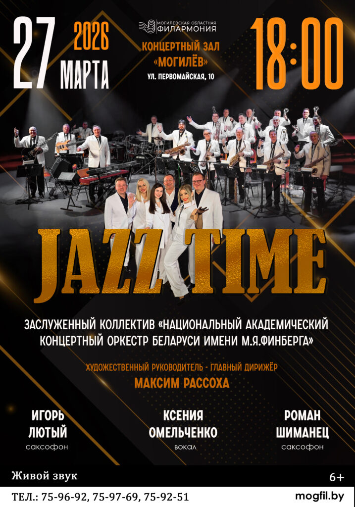 27 марта в КЗ Могилевской областной филармонии Биг-бэнд Заслуженного коллектива Республики Беларусь «Национальный академический концертный оркестр Беларуси имени М.Я. Финберга» представит концертную программу «JAZZ TIME».