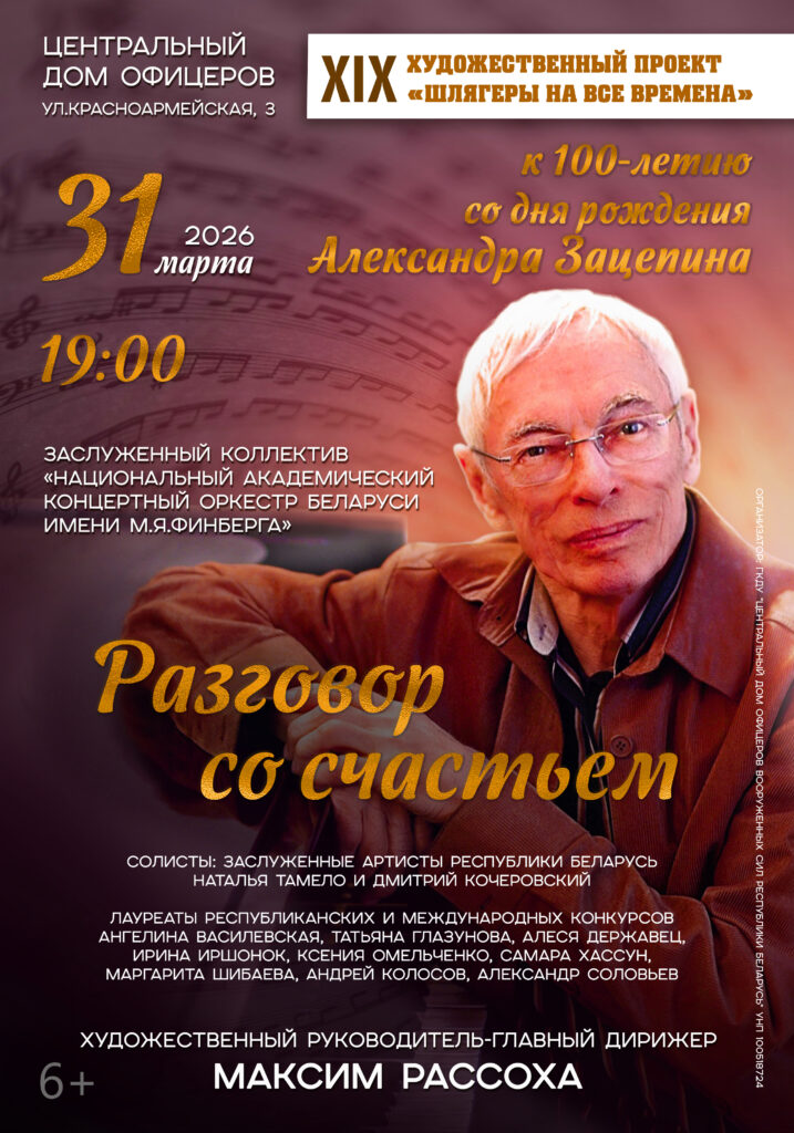 Эстрадно-песенная программа «РАЗГОВОР СО СЧАСТЬЕМ» приурочена к 100-летию легендарного композитора, народного артиста России — Александра ЗАЦЕПИНА.